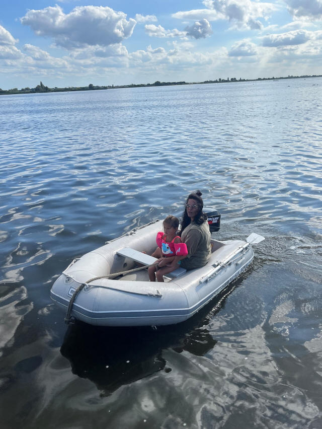 Dochter Irmela met kleindochter Lola in de Quicksilver rubberboot